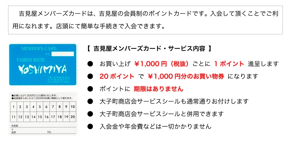 吉見屋の会員制のポイントカードです。入会して頂くことでご利用になれます。入会金や年会費などは一切かかりません。